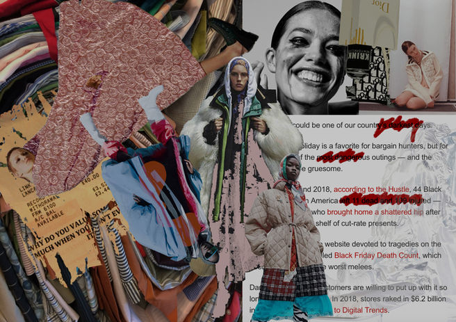 POST $ALE is a story about the reflection of different emotions and feelings individuals who, eager to buy during Black Friday, experience after throwing themselves over an item. For this project, I created 12 moodboards, each representing a specific emotion, such as jealousy or guilt, while visually connecting these feelings to the chaos of the event. The fashion elements captured the essence of Black Friday through layers upon layers of clothing, symbolizing the frantic act of grabbing as much as possible in the shortest time. The project culminated in a single outfit designed to encapsulate the essence of these 12 moodboards, effectively conveying the themes of desperation and the fear of missing out.